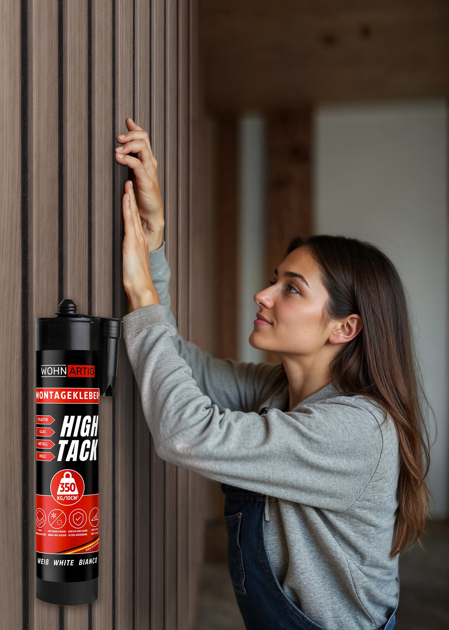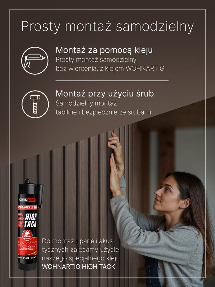 🔧 Montaż bez wiercenia i bałaganu – wystarczy klej WOHNARTIG, aby zamontować panele bez hałasu i kurzu