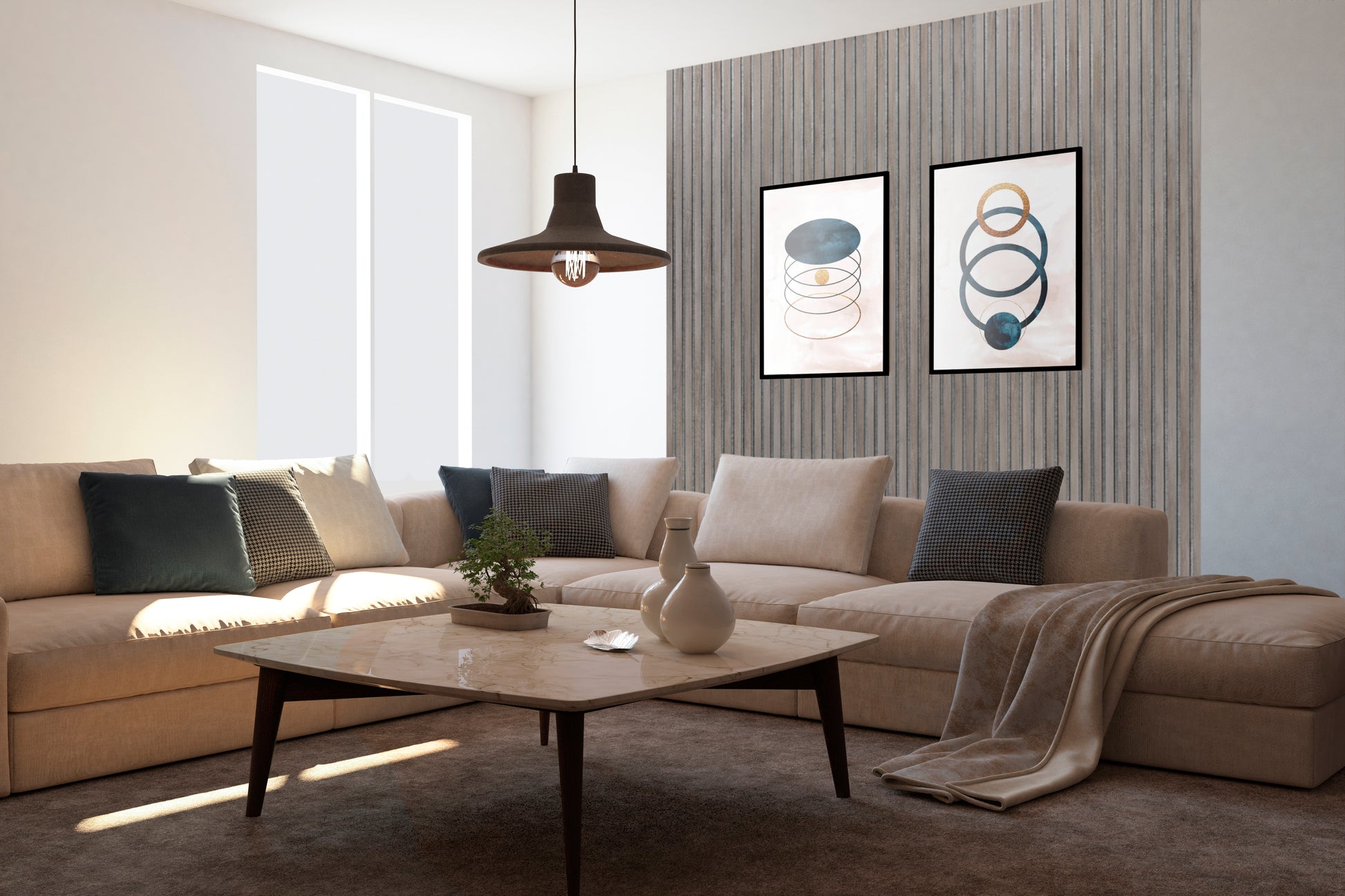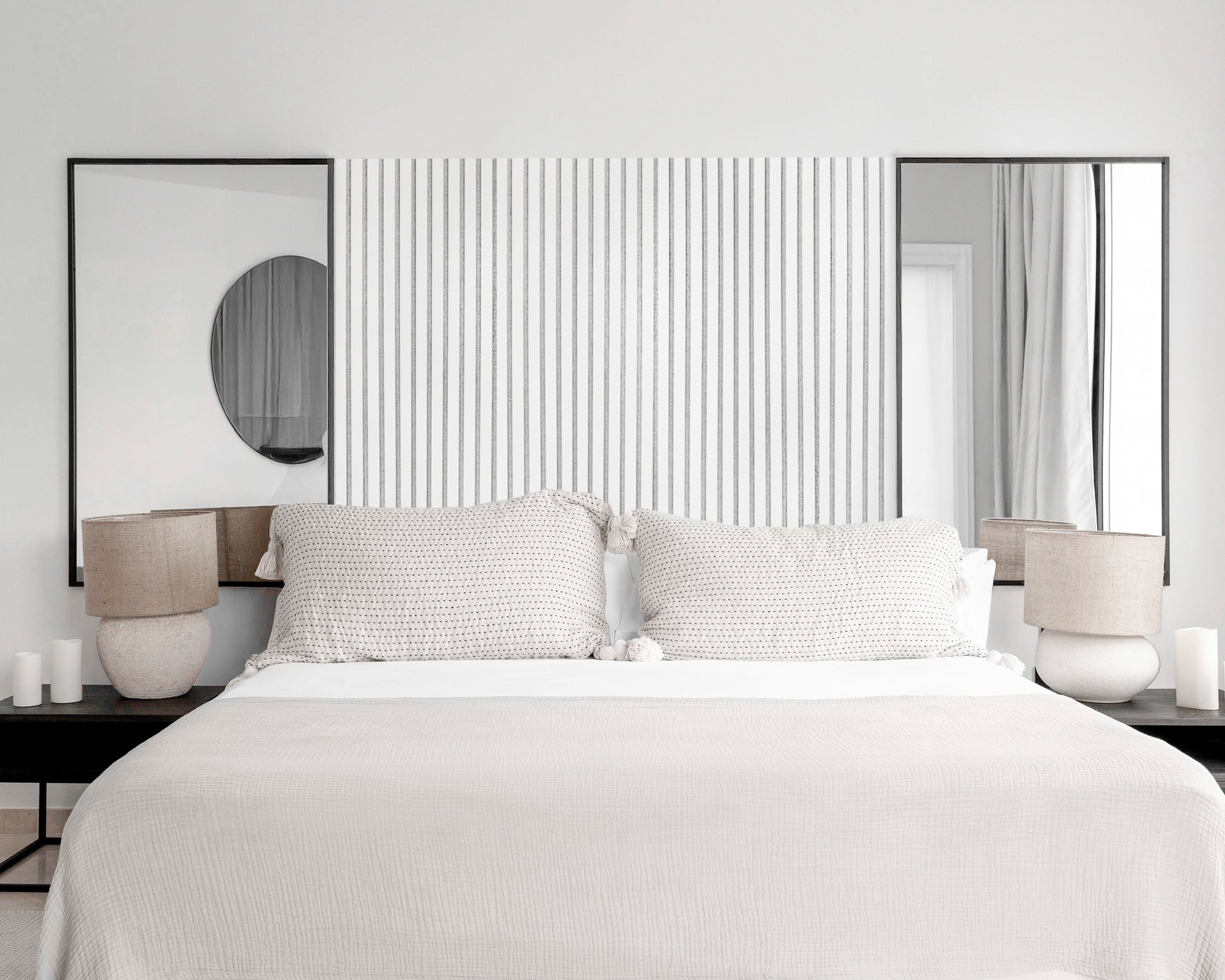 Szary filc w połączeniu z naturalnymi kolorami lameli tworzy lekką, świeżą kompozycję – idealną do wnętrz skandynawskich, minimalistycznych i klasycznych.