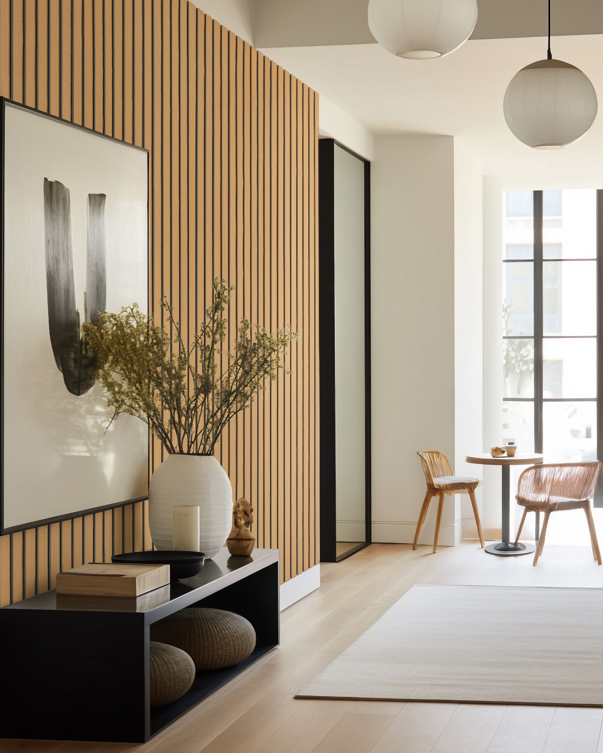 Lamele zamontowane na dźwiękochłonnym filcu tłumią pogłos i niwelują echo – idealne do przestrzeni, w których chcesz się skupić, odpocząć lub rozmawiać bez zakłóceń.