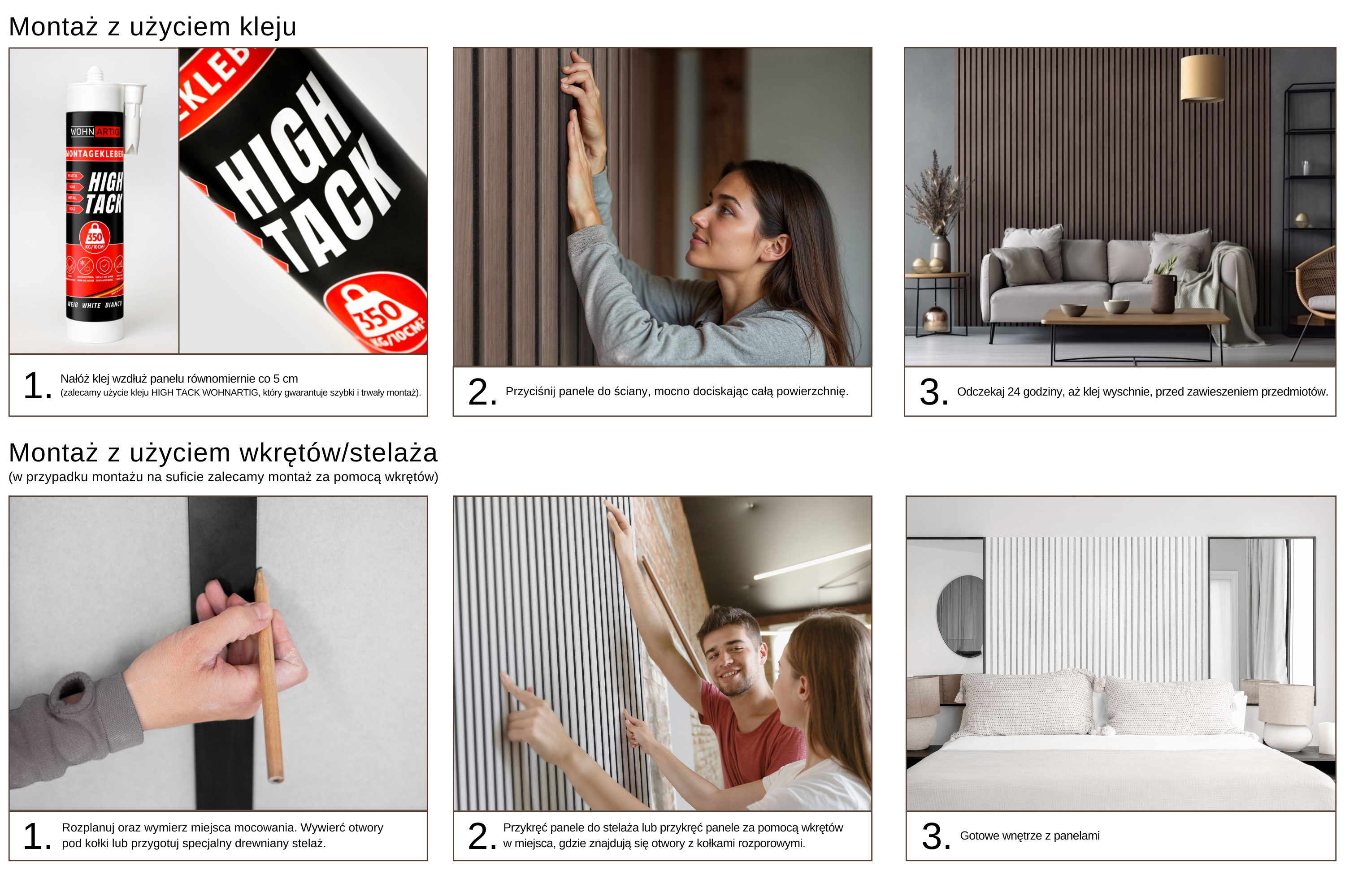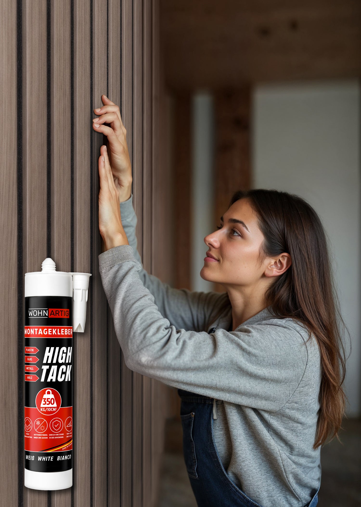 Panele montujesz łatwo i bez wiercenia – polecamy użycie uniwersalnego kleju WOHNARTIG, by zapewnić trwałe i estetyczne mocowanie.