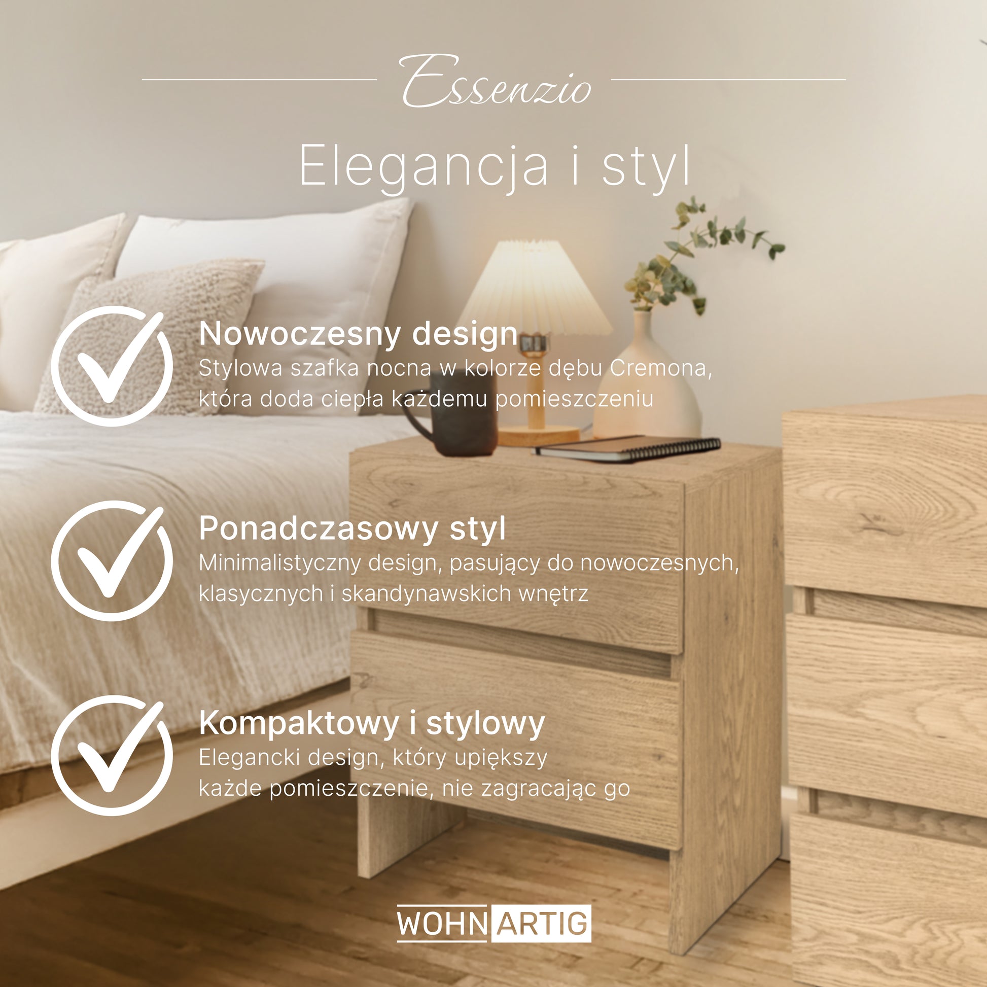 🔸 Stolik nocny ESSENZIO w eleganckim odcieniu dąb Cremona to połączenie funkcjonalności, wygody i ponadczasowego stylu. Z łatwością dopasujesz go do swojej sypialni, tworząc harmonijną aranżację.