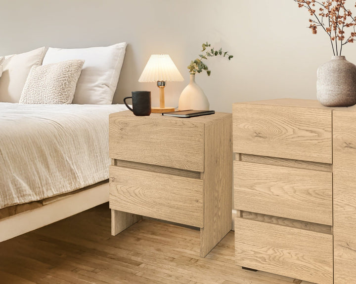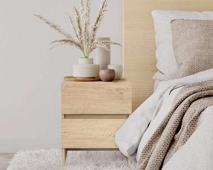 🔸Nowoczesna forma i naturalny odcień drewna sprawiają, że szafka nocna doskonale wkomponuje się w różne style wnętrz – od minimalistycznego po klasyczny i skandynawski. Wyposażona w dwie pojemne szuflady, oferuje jeszcze więcej miejsca na książki, kosmetyki, ładowarkę czy inne akcesoria, które chcesz mieć zawsze pod ręką.