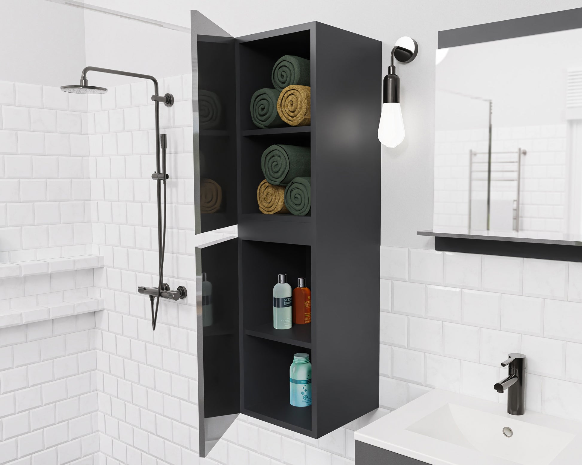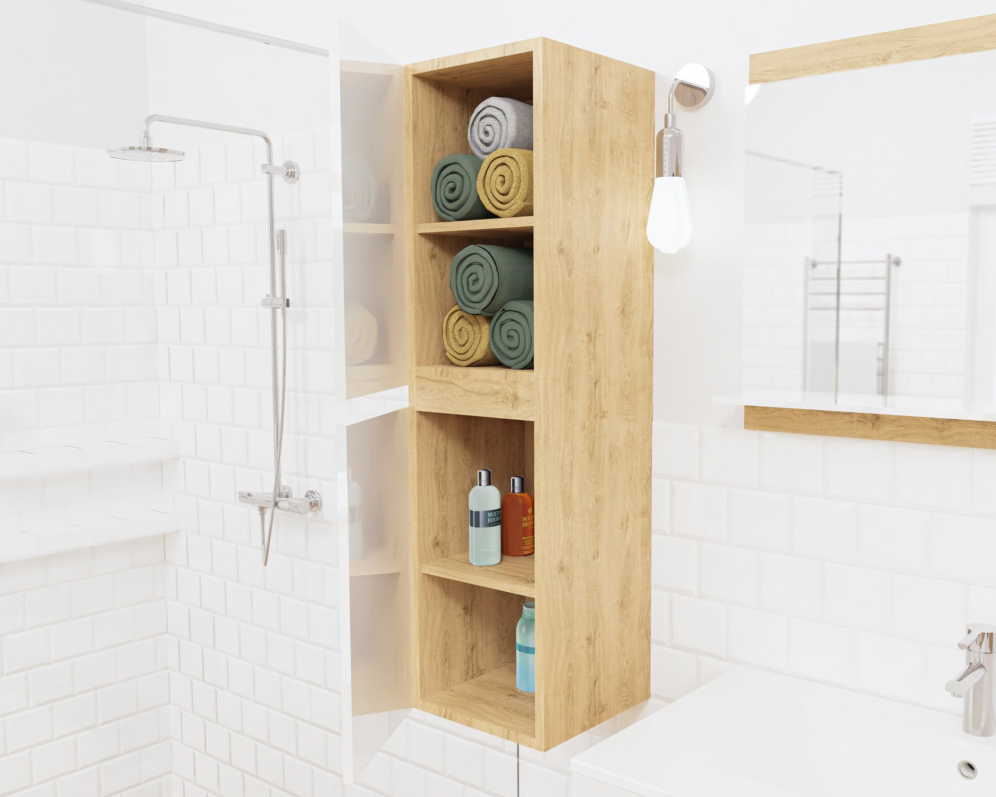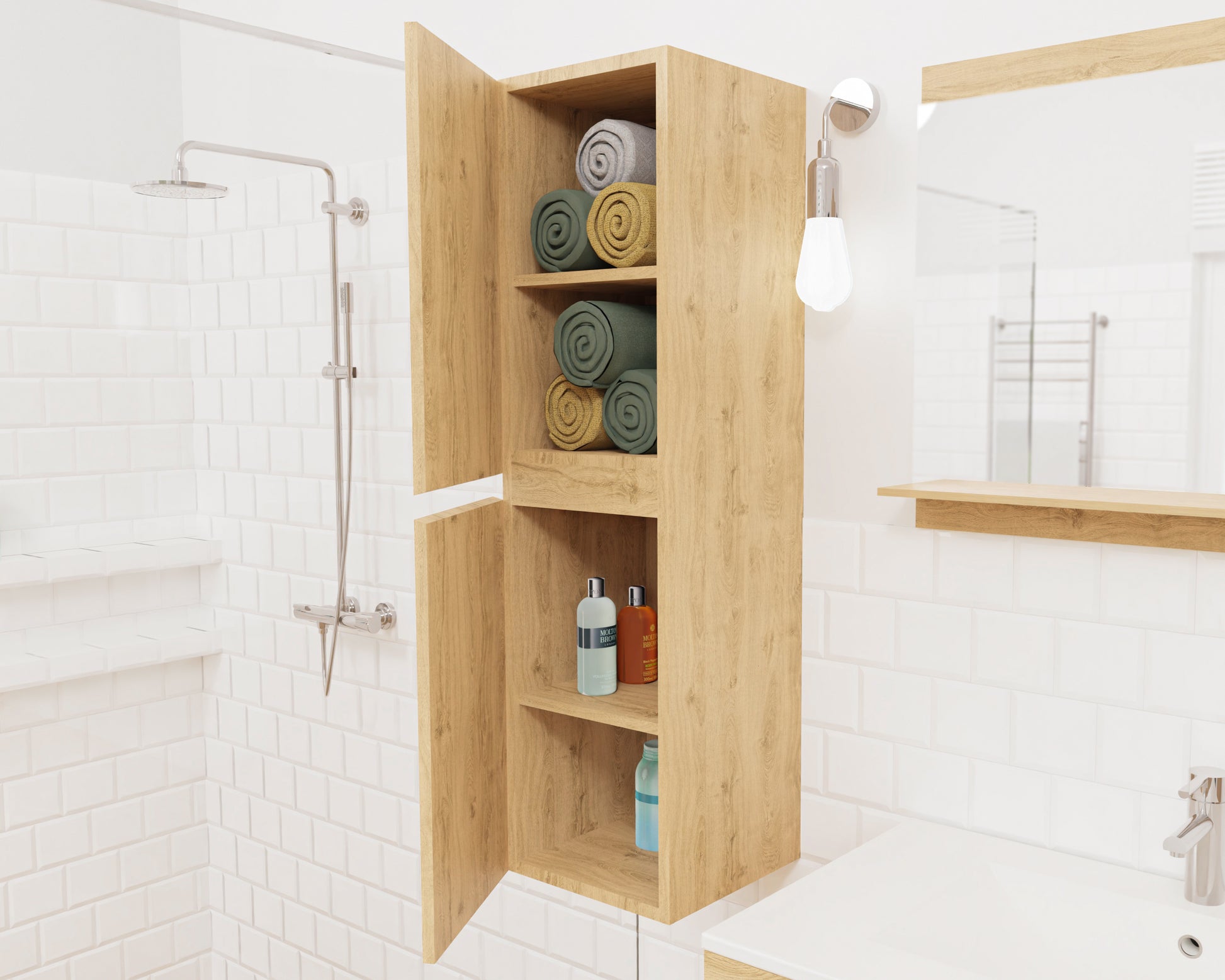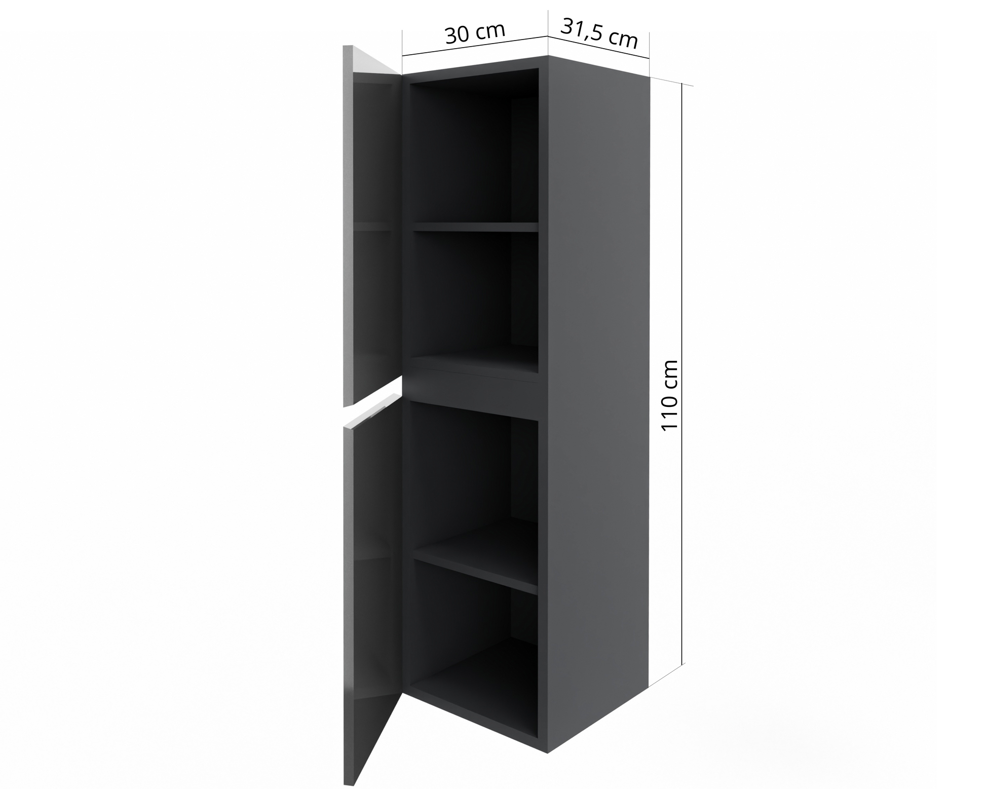 Słupek łazienkowy STELLA to stylowy, wiszący mebel, który świetnie sprawdzi się zarówno w małych, jak i średnich łazienkach. Dzięki kompaktowym wymiarom 30 x 31,5 x 110 cm oferuje zaskakująco dużo miejsca do przechowywania – za dwojgiem drzwiczek ukryte są cztery funkcjonalne półki na ręczniki, kosmetyki czy środki czystości.