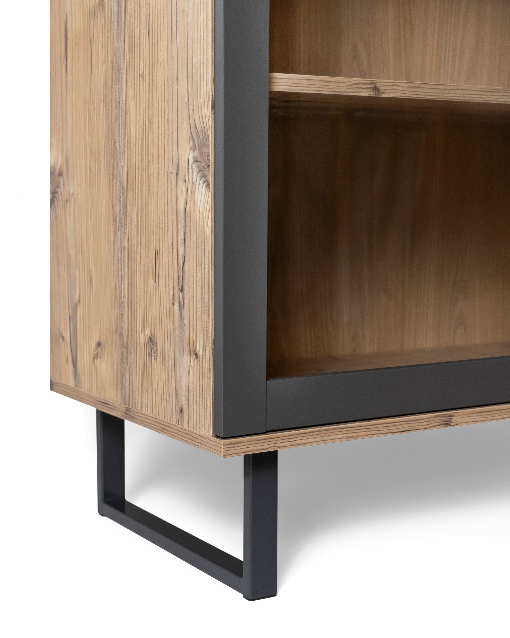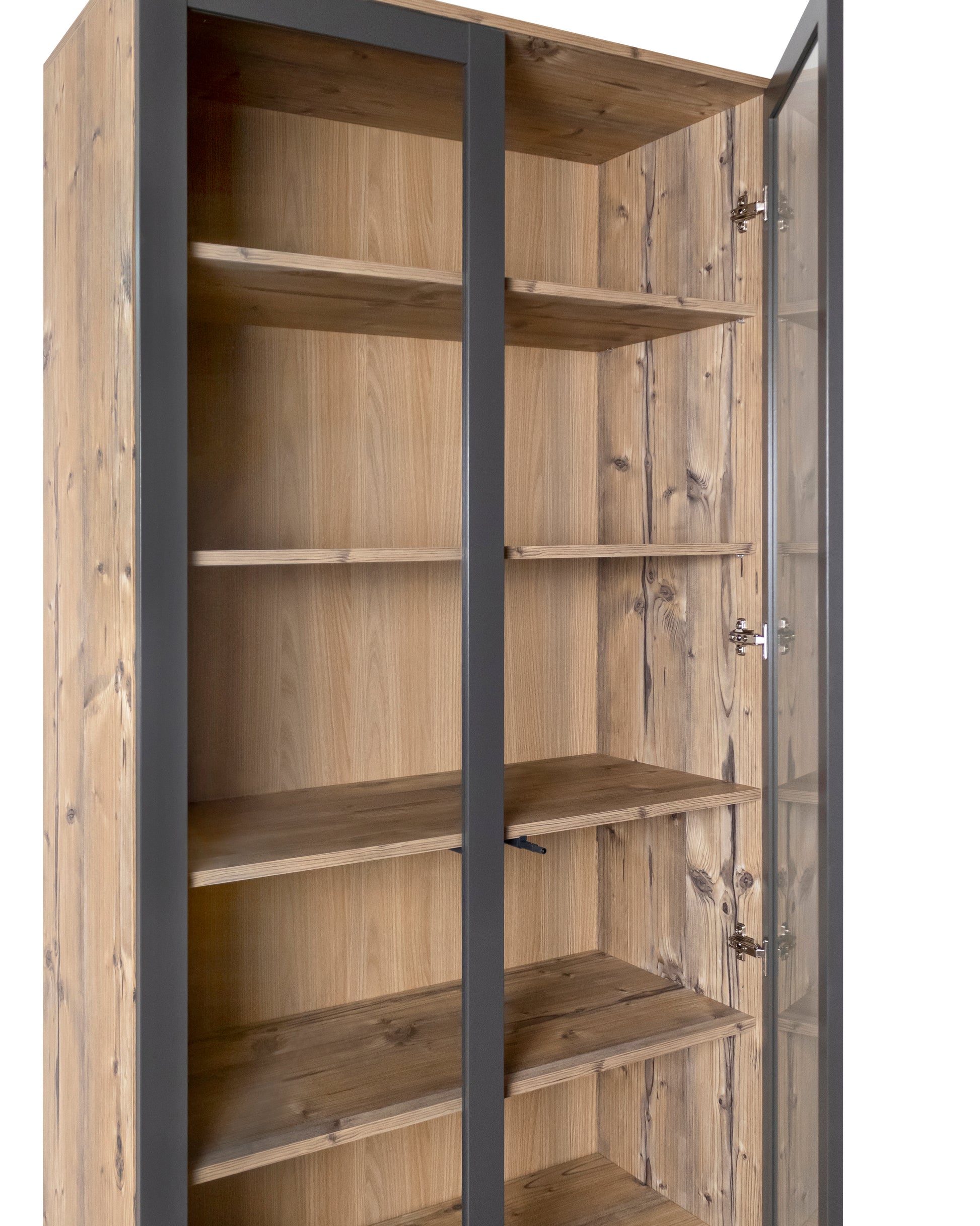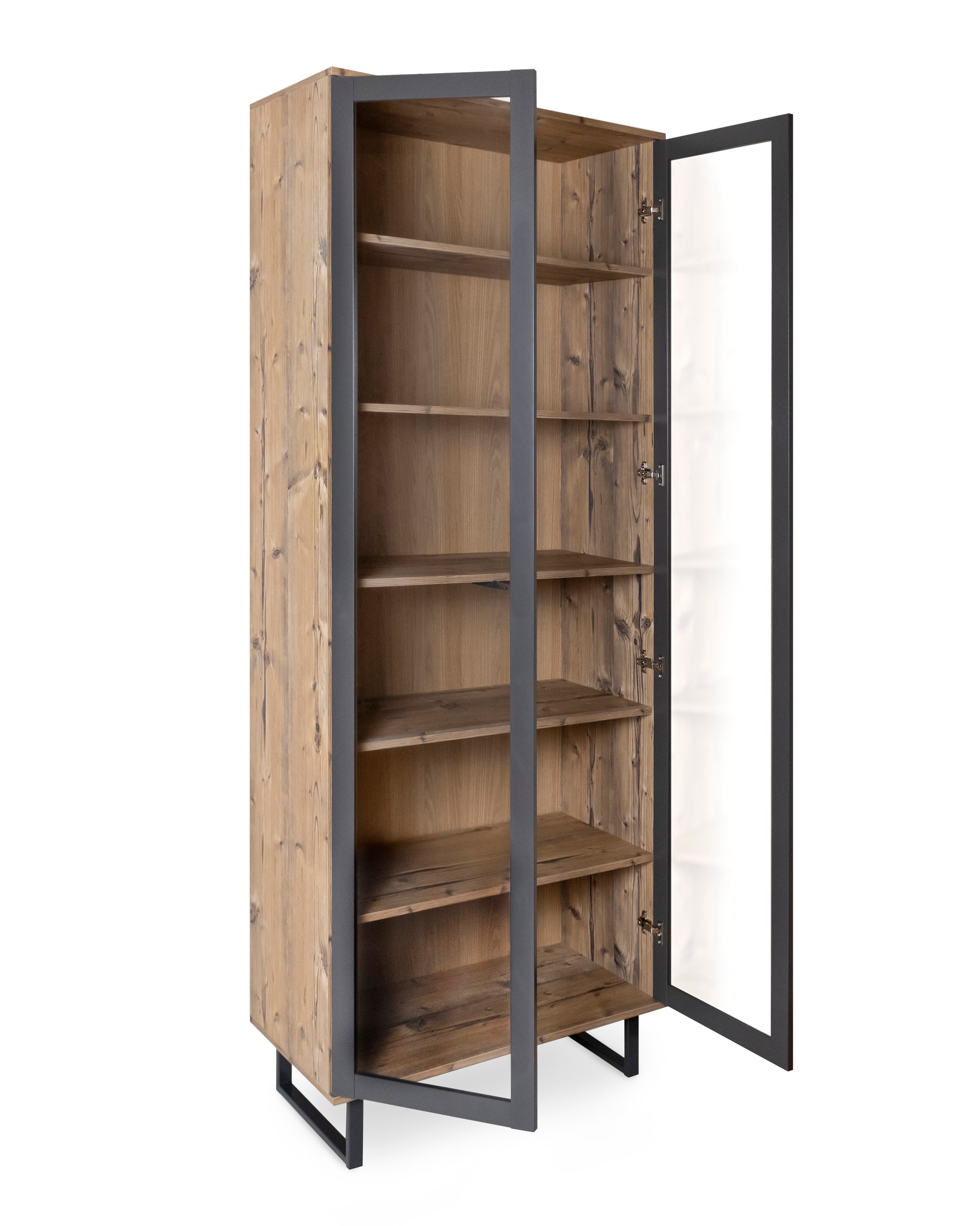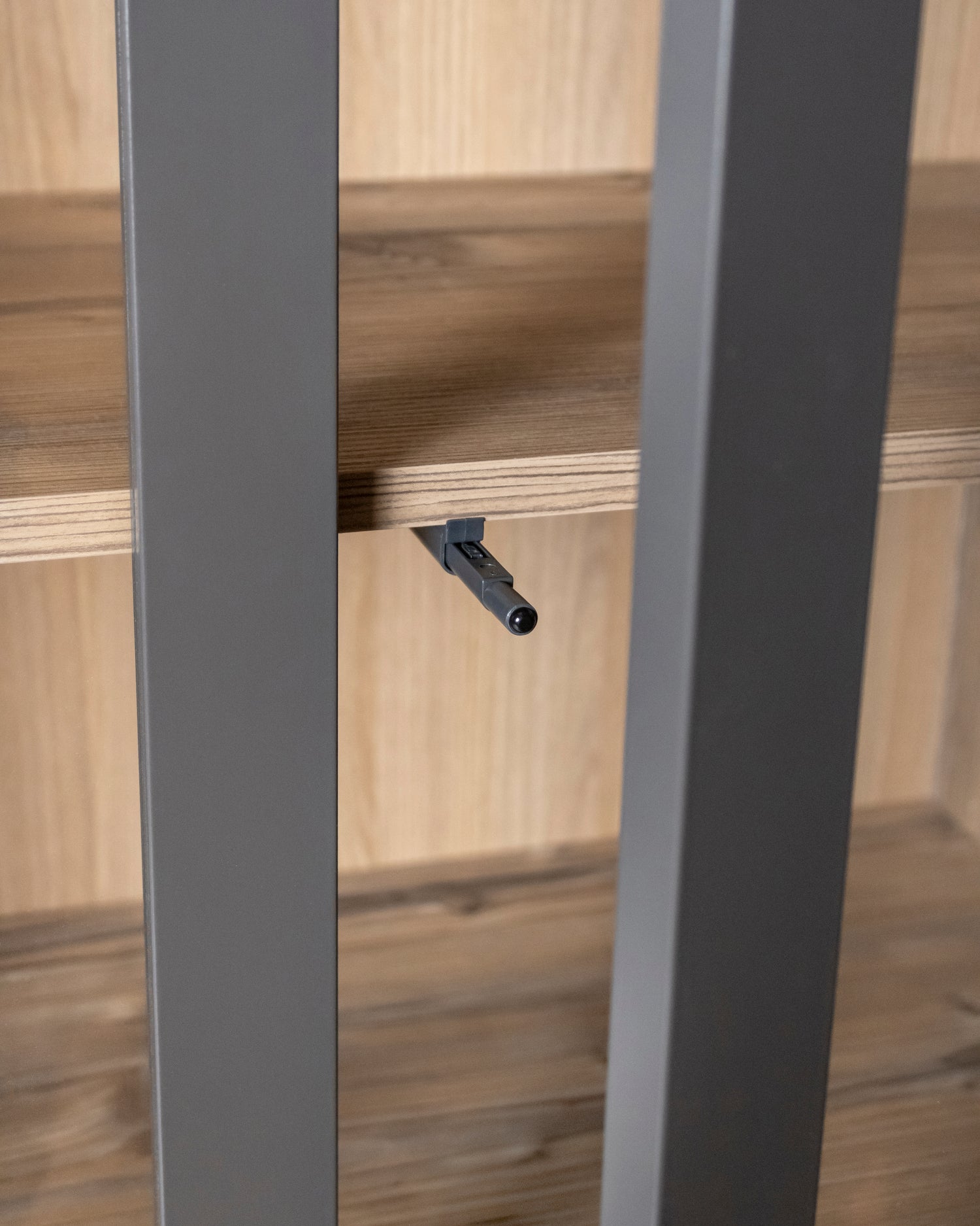Witryna w odcieniu drewna dębowego to elegancki i funkcjonalny mebel, który idealnie sprawdzi się w salonie, jadalni lub gabinecie. Smukła konstrukcja łączy naturalne ciepło drewna z nowoczesnym charakterem metalowych elementów. Dzięki przeszklonym, podwójnym drzwiom z metalową ramą oraz sześciu pojemnym półkom wyeksponujesz dekoracje, książki czy szkło w estetyczny i zorganizowany sposób. Stabilna metalowa podstawa i system otwierania „na naciśnięcie” zapewniają komfort użytkowania oraz trwałość na lata.