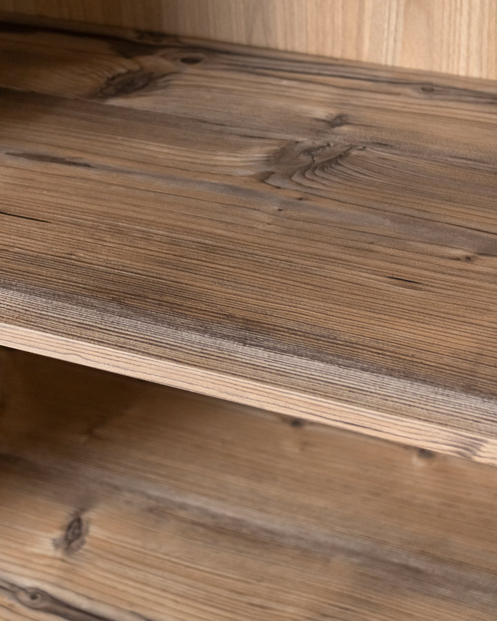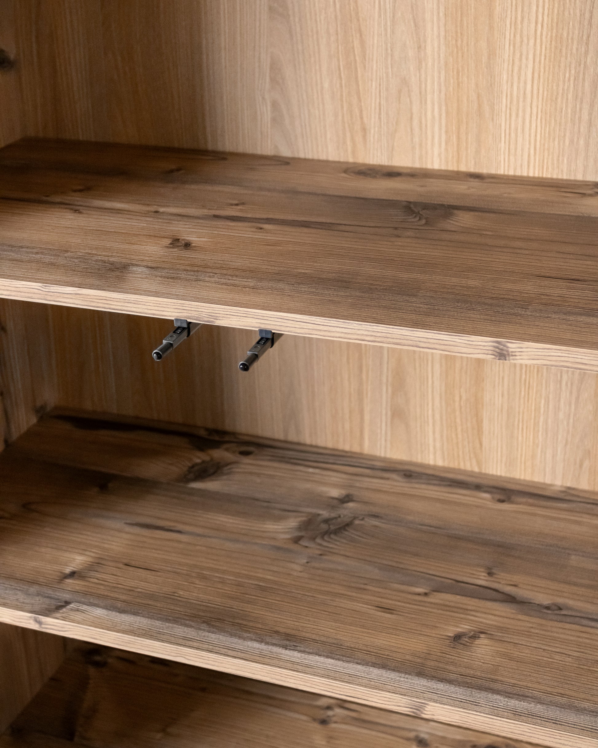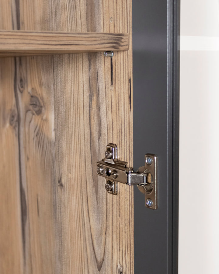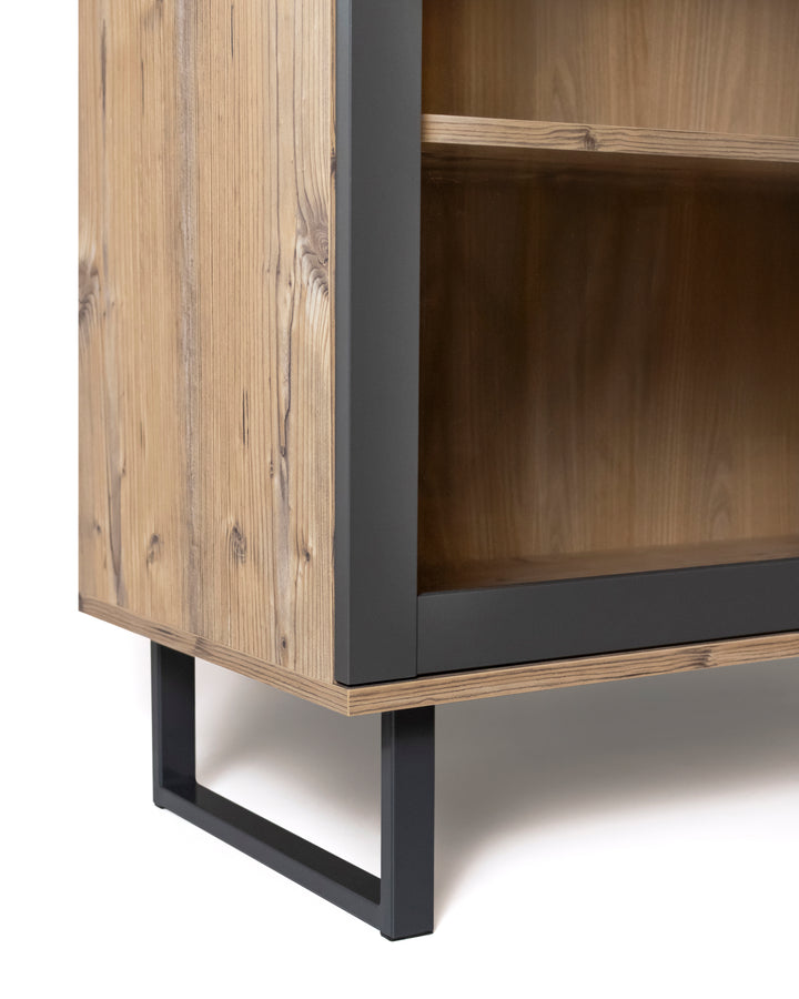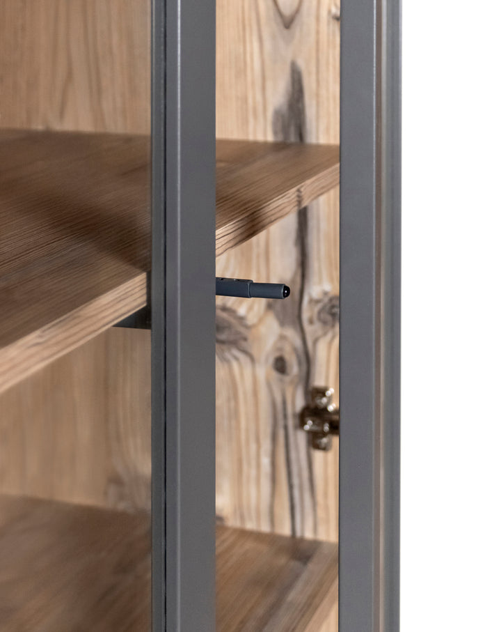 Witryna w odcieniu drewna dębowego to elegancki i funkcjonalny mebel, który idealnie sprawdzi się w salonie, jadalni lub gabinecie. Smukła konstrukcja łączy naturalne ciepło drewna z nowoczesnym charakterem metalowych elementów. Dzięki przeszklonym, podwójnym drzwiom z metalową ramą oraz sześciu pojemnym półkom wyeksponujesz dekoracje, książki czy szkło w estetyczny i zorganizowany sposób. Stabilna metalowa podstawa i system otwierania „na naciśnięcie” zapewniają komfort użytkowania oraz trwałość na lata.